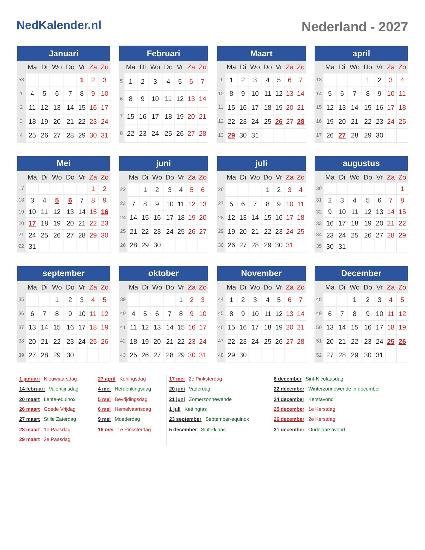 Nederlandse Kalender 2027