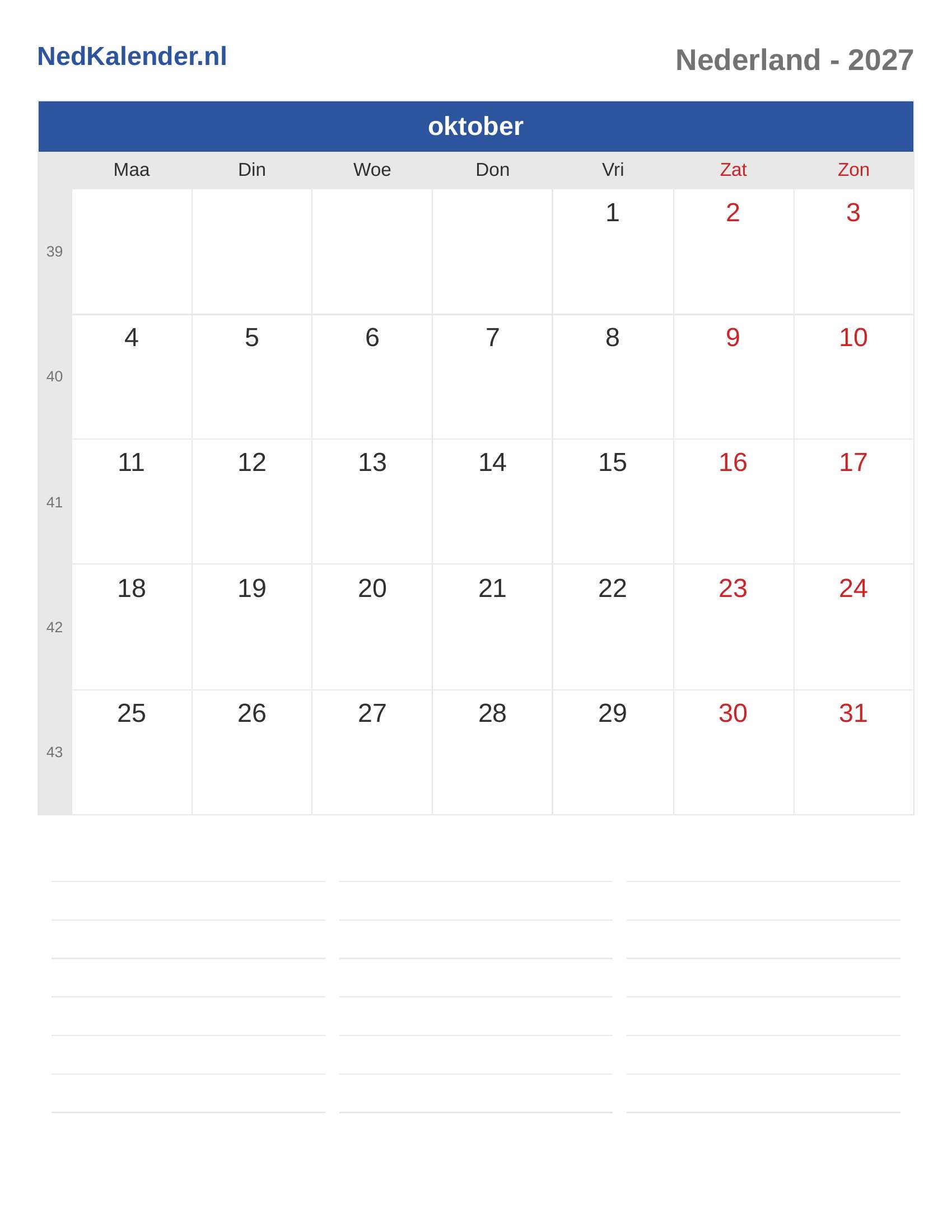 Nederland Kalender 2027 - oktober